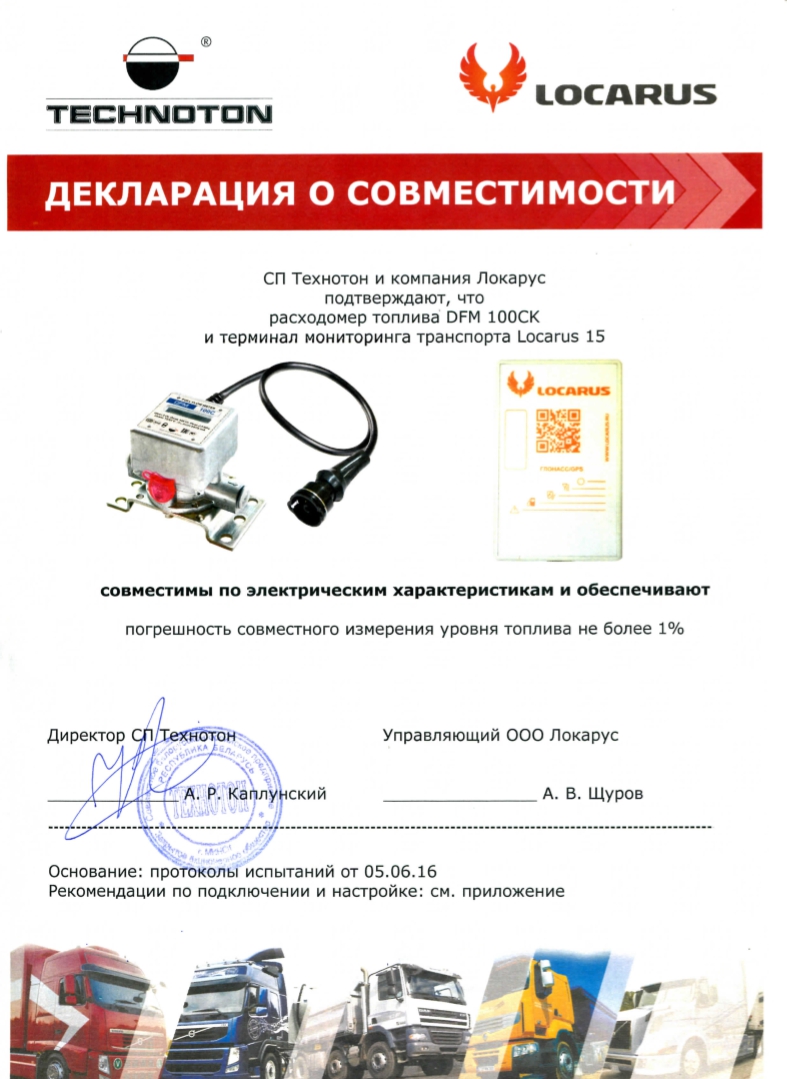 Получили из Минска Декларации о Совместимости для наших LOCARUS 15 и технотоновских датчиков трёх типов: проточного датчика расхода топлива, емкостного датчика уровня топлива с интерфейсом RS-485 и емкостного датчика уровня топлива с частотным интерфейсом.