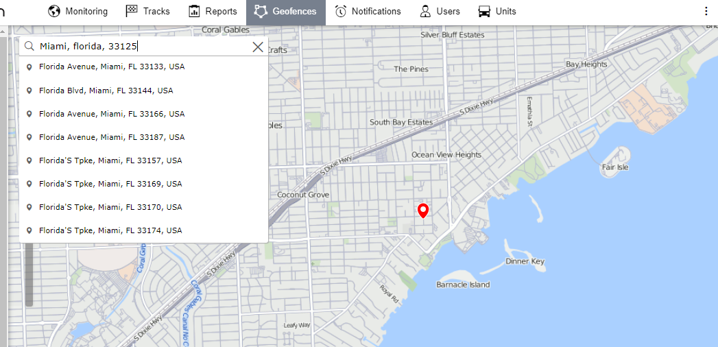 Similar to your dynamic SEARCH feature in wialon hosting UI in the top left corner of your map. I can type even just a zip code, and your system locates the general area of that zip copy, and places a pindrop in the center, and I can double click that pindrop location and put the center point of the geofence there.